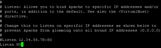 Then look for the line that says “Listen 80″ and change it to 127.0.0.1:8080: